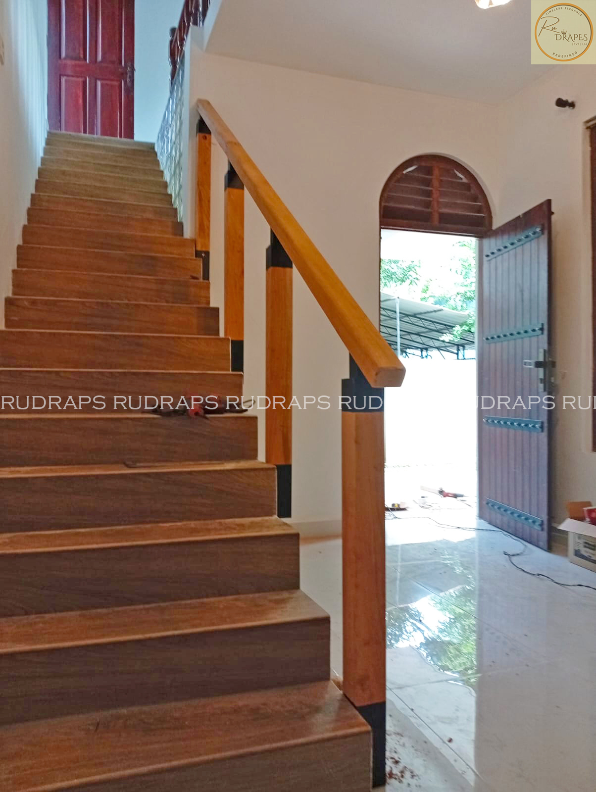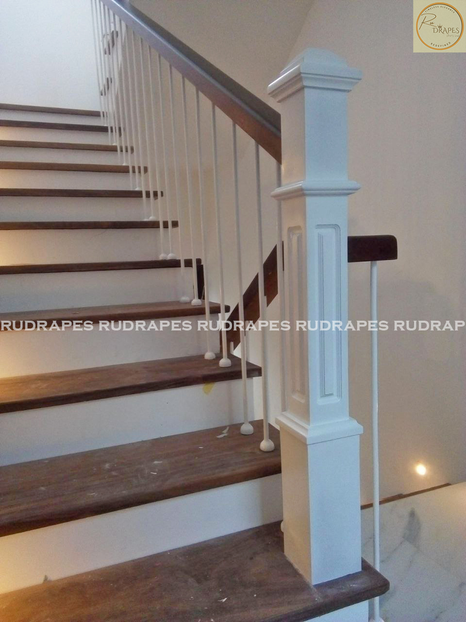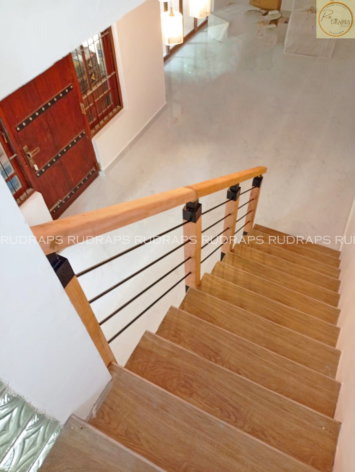 The natural wood finish of the handrail adds a touch of elegance and warmth, while the powder-coated steel balusters provide durability and a striking visual contrast against the light walls and flooring. The result is a clean, refined aesthetic that enhances both safety and style.