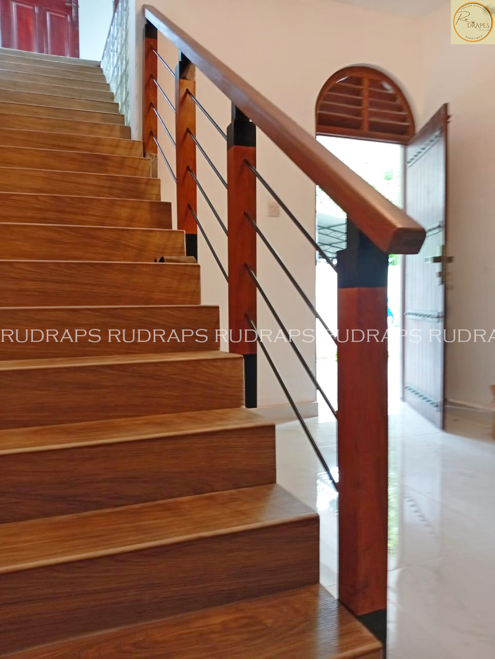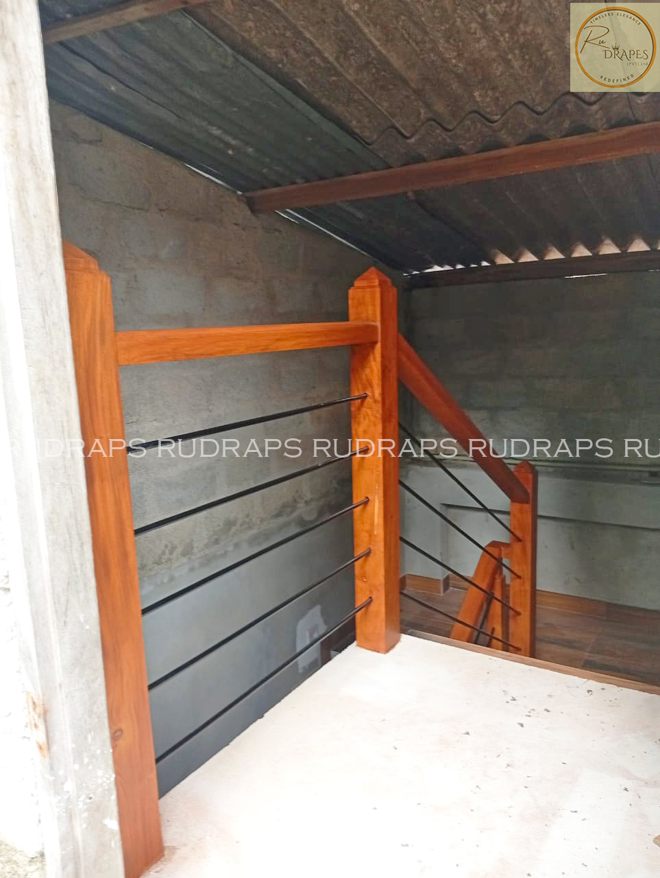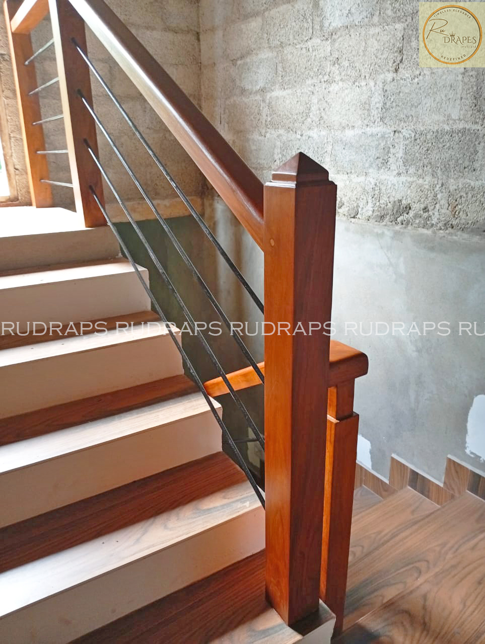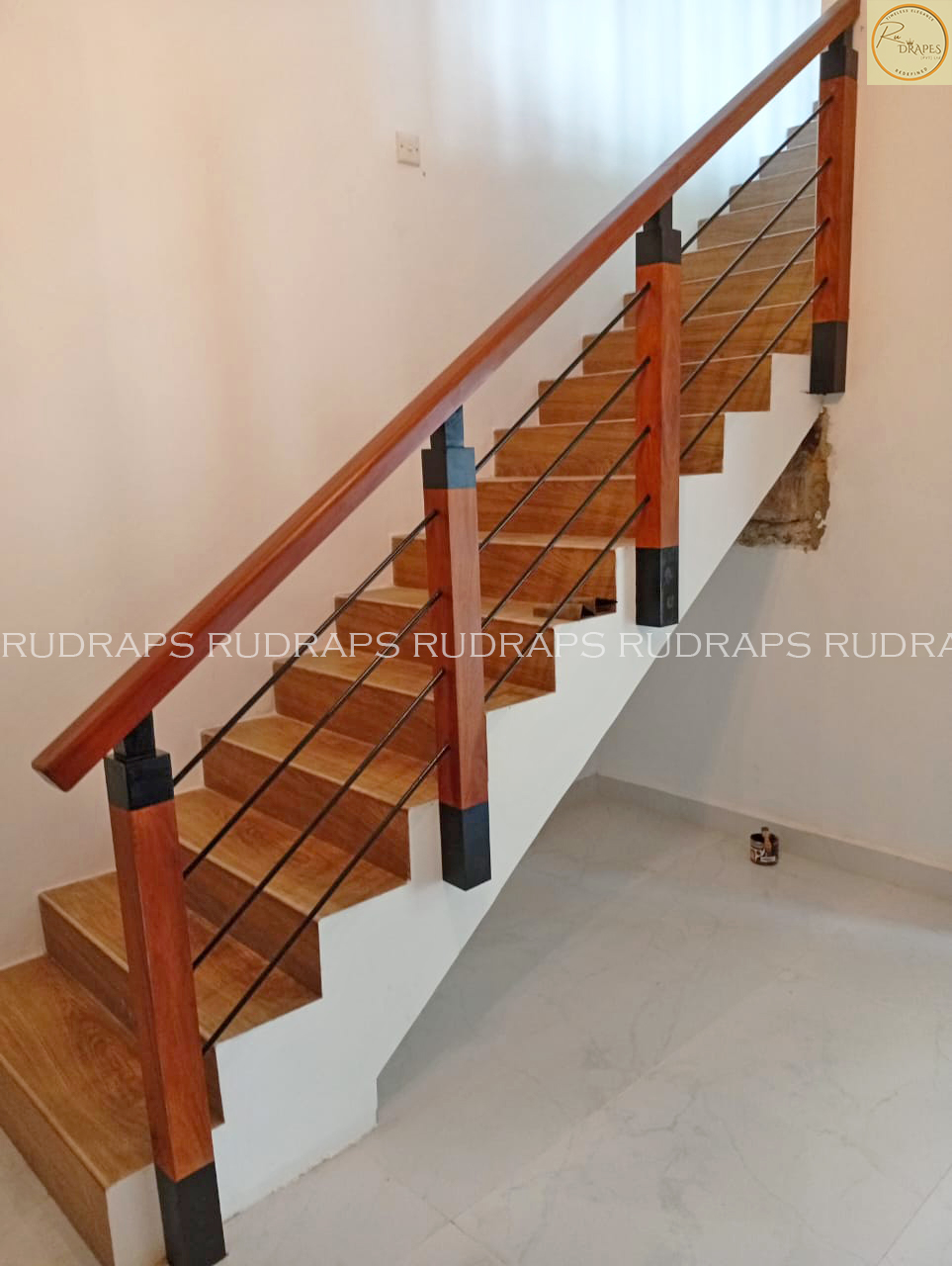 This project presents a minimalist staircase railing design that combines warm wooden handrails and newel posts with sleek vertical black metal balusters. The design emphasizes simplicity, functionality, and visual openness, making it ideal for modern residential interiors.