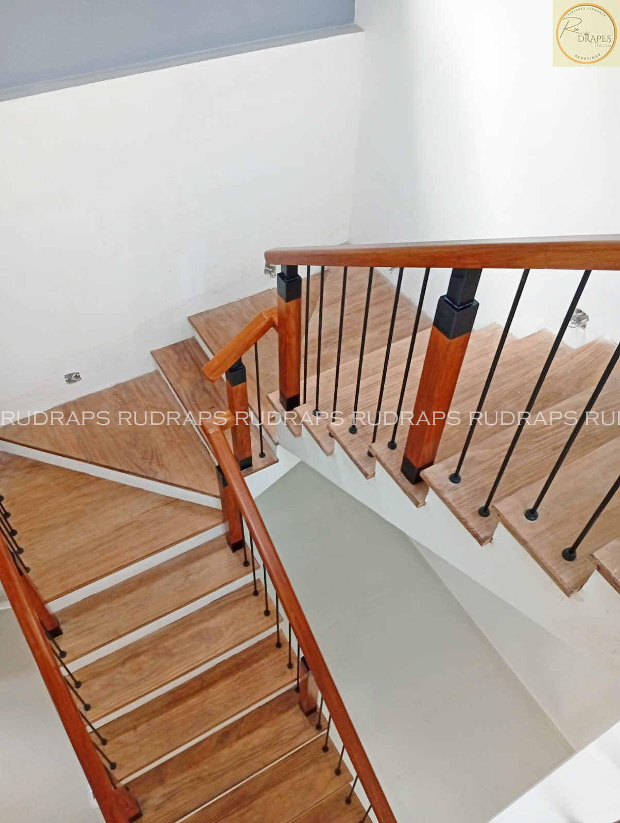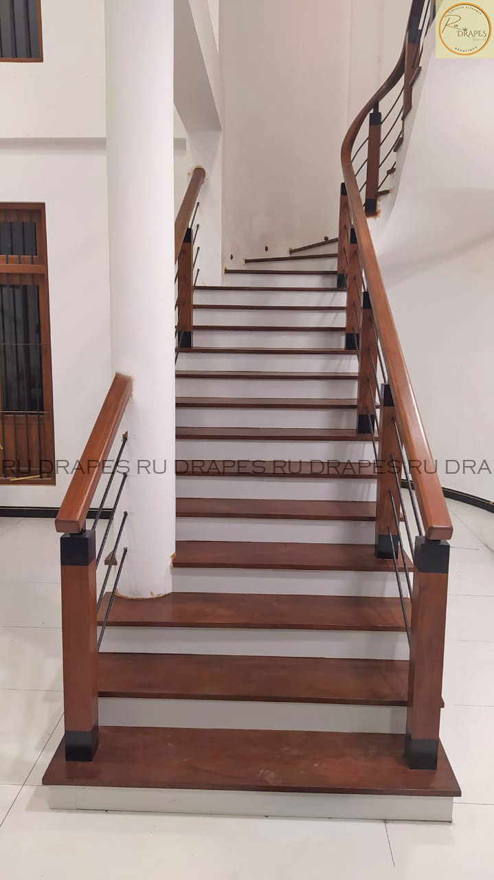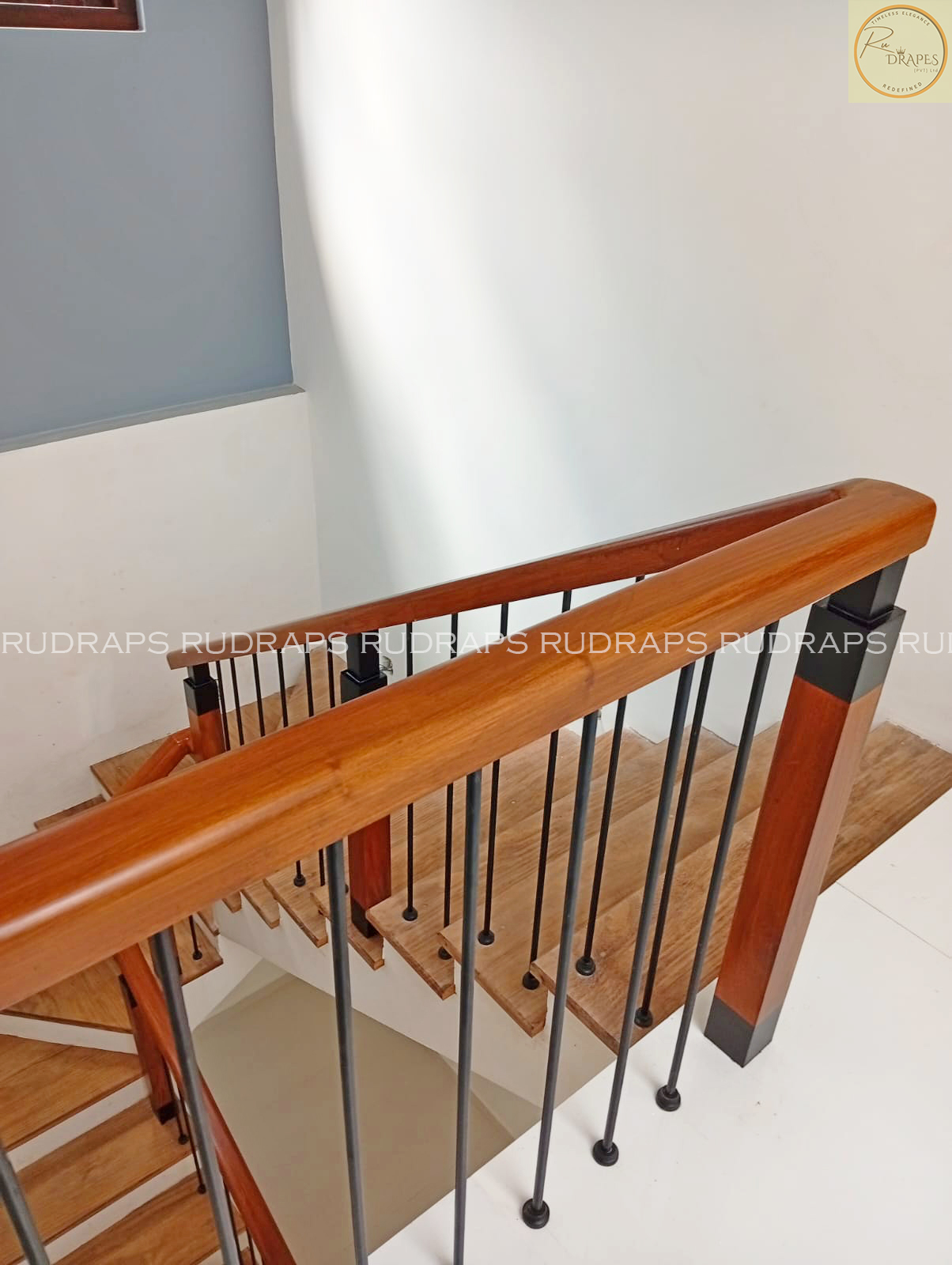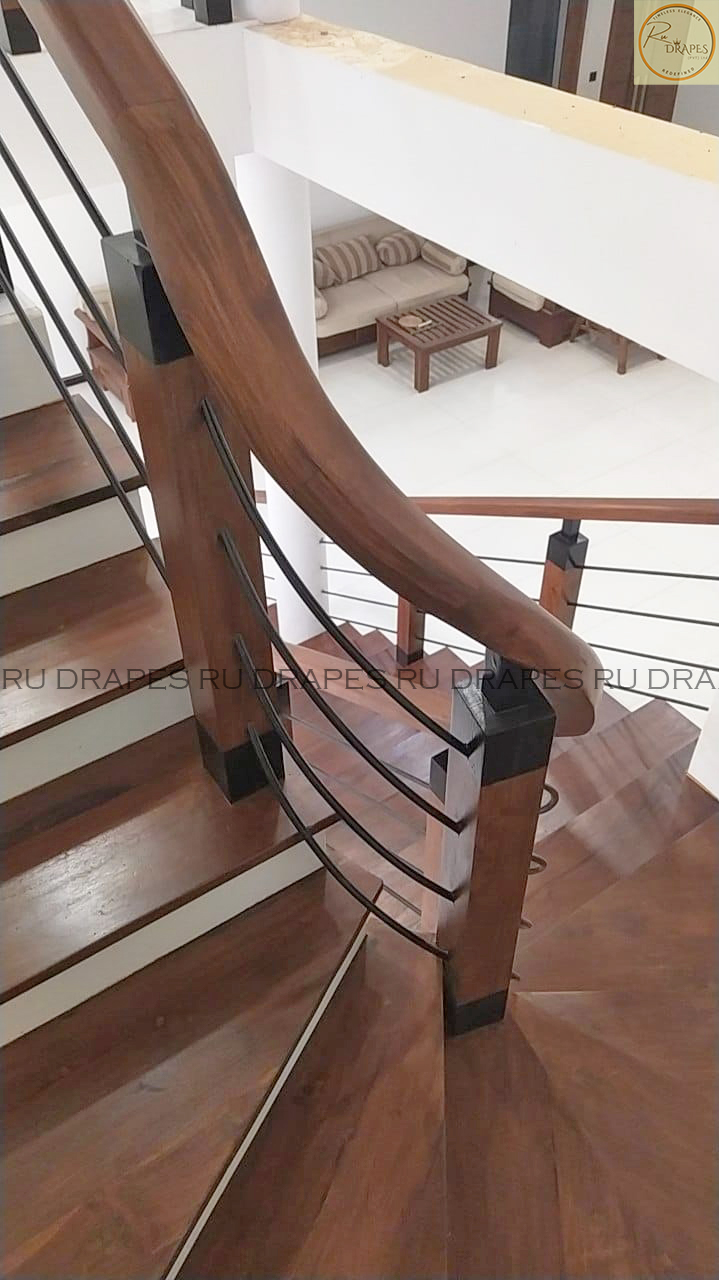 This project showcases a Curved winder staircase railing design that elegantly combines solid teak wood handrails with powder-coated black metal balusters. The design emphasizes simplicity, durability, and aesthetic appeal, creating a perfect balance between modern and natural materials.