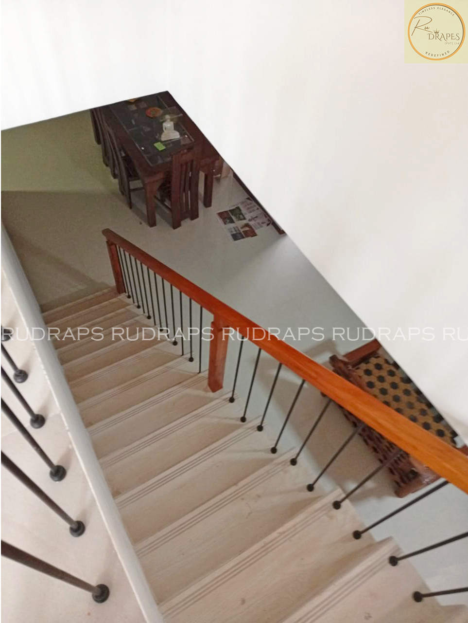 The staircase is built with precision craftsmanship, ensuring both aesthetic balance and structural integrity. The wide wooden handrail provides comfort and stability, while the horizontal metal lines enhance openness and visual continuity within the space.